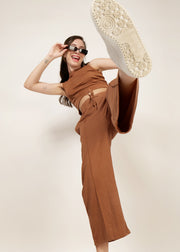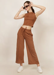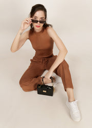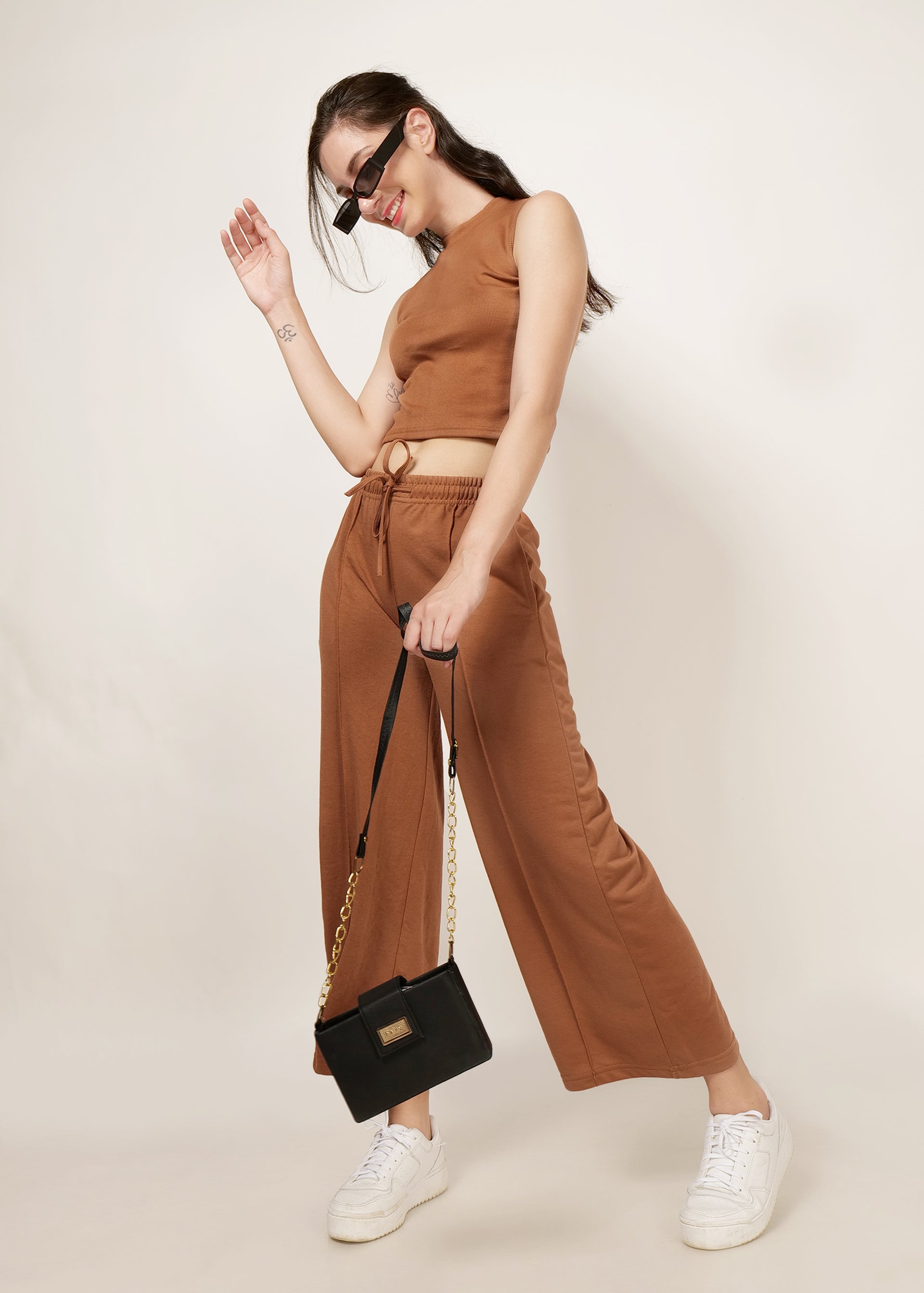 Solid brown broad pant and mock neck rib tank top co-ord set
