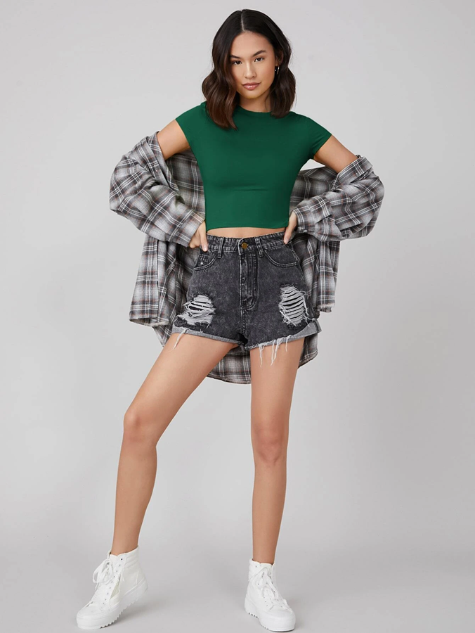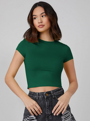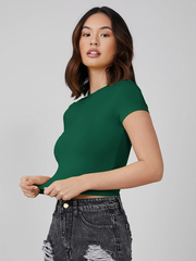 Summer Green Crew neck Bottle Green Ribbed top With short sleeves