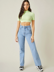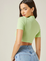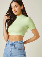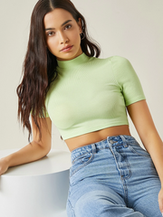 Summers Mint Mock Neck Ribbed Crop Half Sleeve Light Green Mint Colour