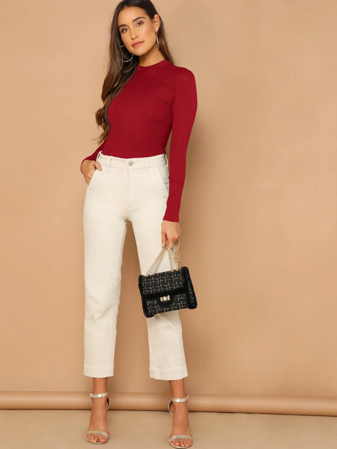 Women's Maroon lycra Body Fitted T-Shirt full Sleeve with mock neck